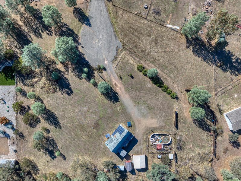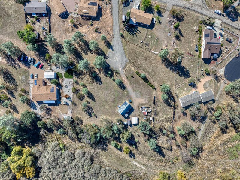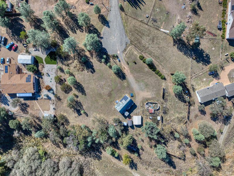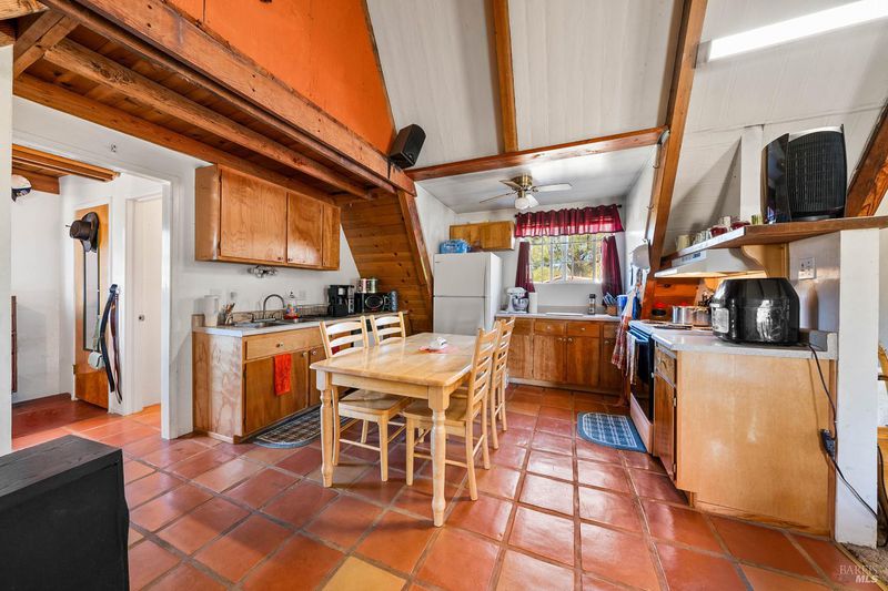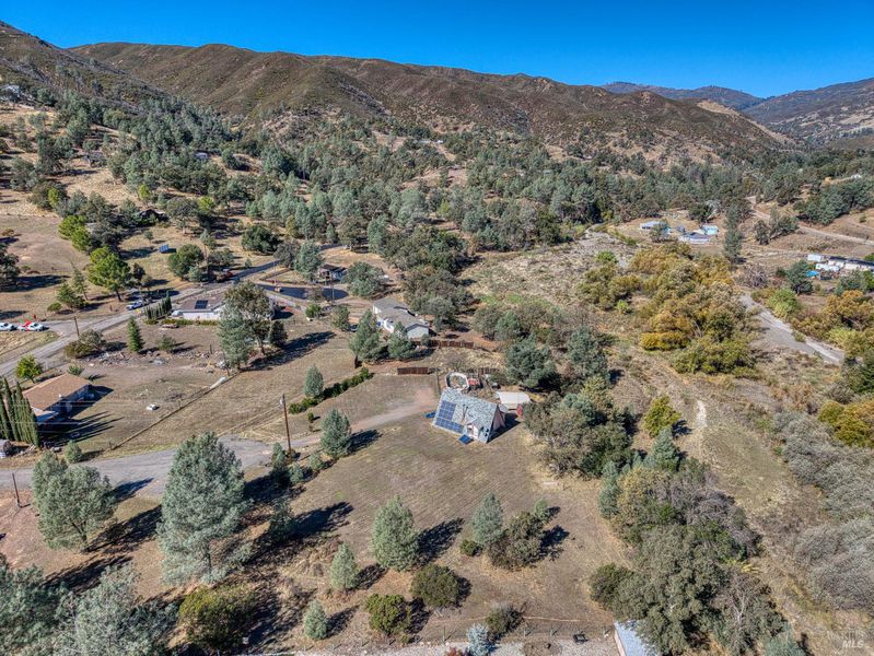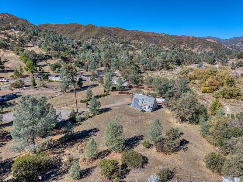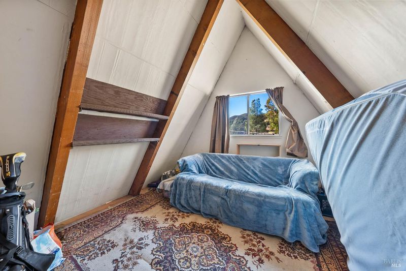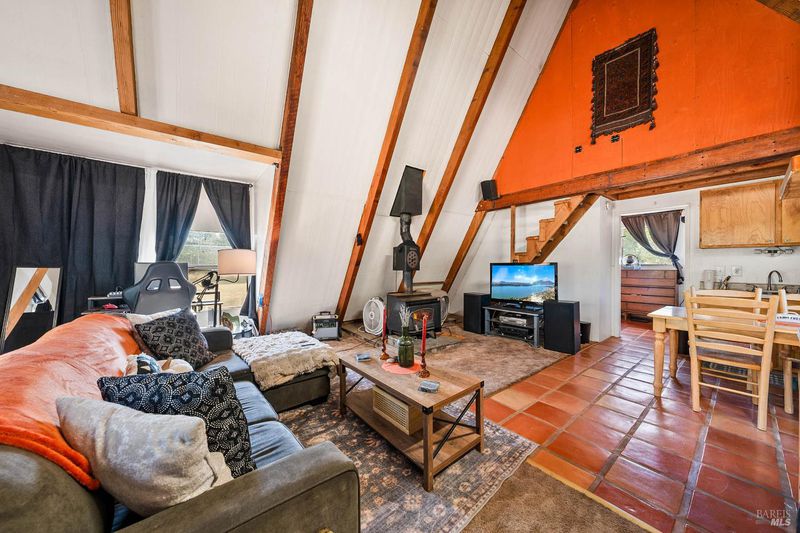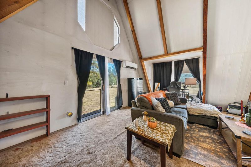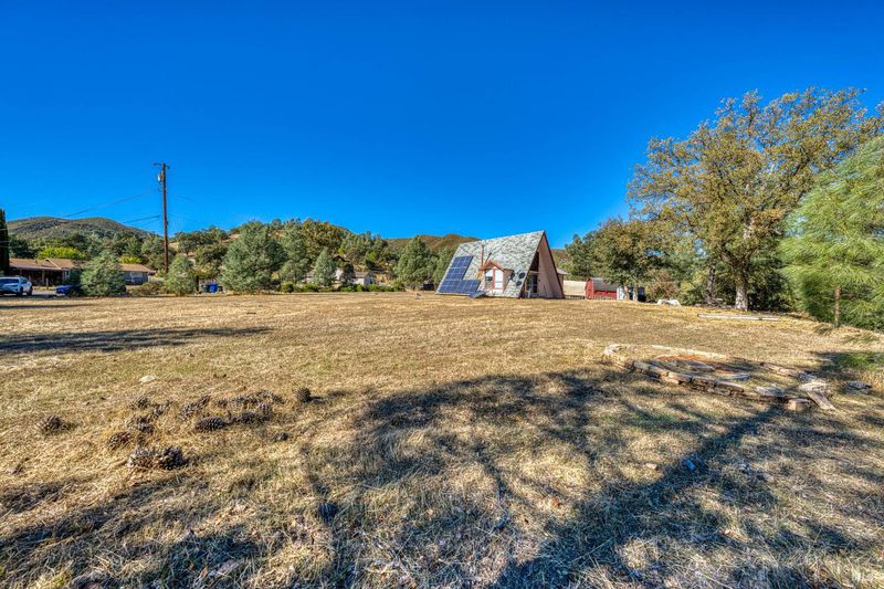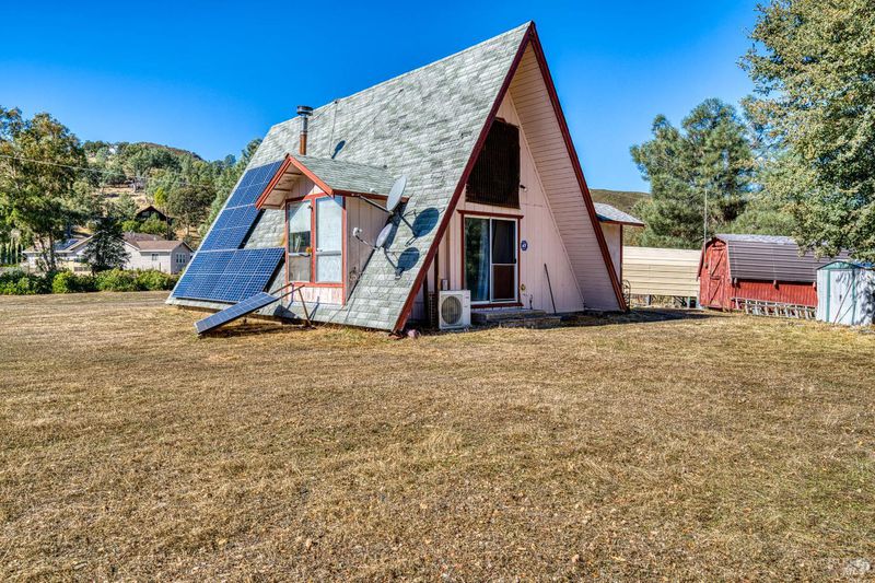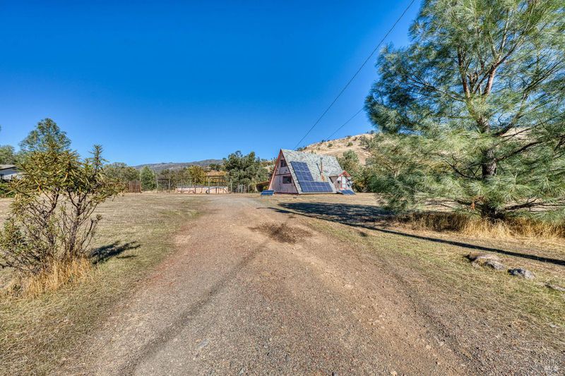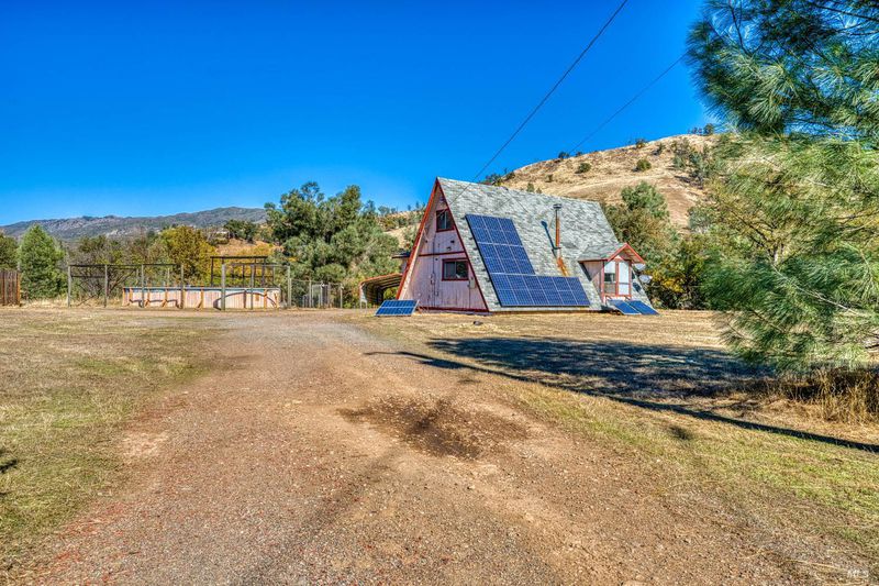 2 story A-Frame 1981 home with 1-bedroom, 1-full bathroom with upstairs loft that can be a potential bedroom or used for storage. This Tahoe feeling cabin style on .92 acres of owned land in beautiful Spring Valley Ca is one-of-a kind! Measuring at 816 square feet, the living room is very spacious as it opens to the dining area, kitchen and the one bedroom is cozy. Kitchen offers electric stove, dishwasher, refrigerator, and dual sink. Stackable washer and dryer is located in the bathroom. This incredibly sweet cabin has tall, vaulted ceilings, fireplace in the living room, fully functioning kitchen and solar with battery that is fully paid. Mini split to run A/C and heat. Property has 2-storage sheds outside. Metal carport to park your car plus additional parking throughout the property. Community WELL is 65.00 a month. Electric water heater. Perfectly placed in its very private and natural setting that borders along Wolf creek that runs seasonal. Estimated 10 min drive to Hwy 20.