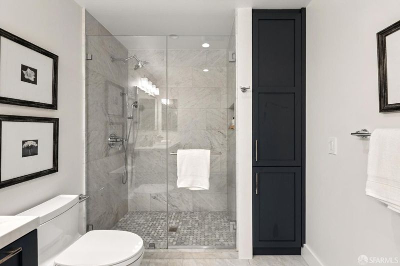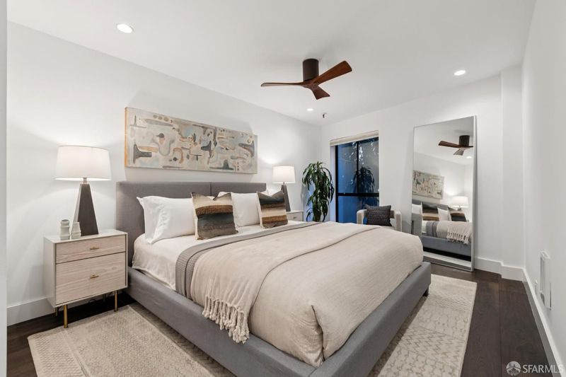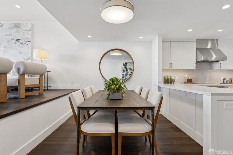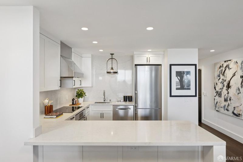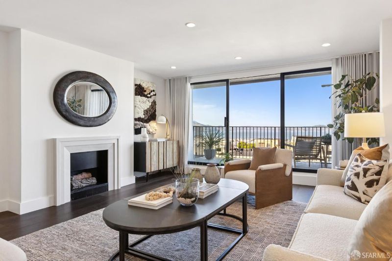 Perched on one of Pacific Heights' most coveted blocks, this beautifully renovated two-bedroom, two-bath residence offers iconic San Francisco views and seamless indoor-outdoor living. Fully renovated in 2019, the home captures sweeping vistas of the Golden Gate Bridge, the Bay, Alcatraz, and the Palace of Fine Arts through expansive wall-to-wall living room windows. The light-filled living and dining areas open directly to a generous private deck, creating an exceptional setting for entertaining or quiet enjoyment. The modern kitchen features custom cabinetry, Vadara quartz countertops, Bosch appliances, and elegant contemporary finishes. Two well-proportioned bedrooms provide comfort and privacy, complemented by stylishly finished bathrooms with marble details. Positioned at the corner of the building, this residence enjoys added privacy and a wider floor plan than most, making it one of the most desirable units in the building. Additional features include one-car parking, a private storage locker, in-unit laundry, elevator access, and secure entry.