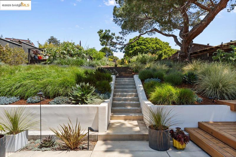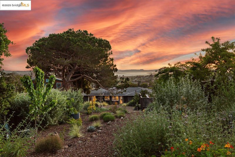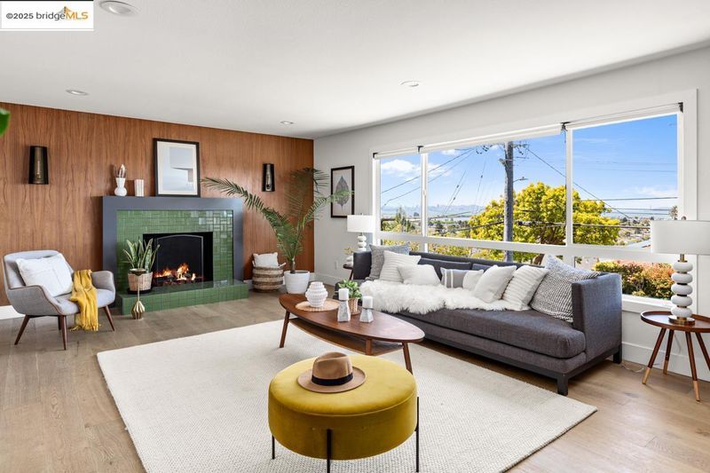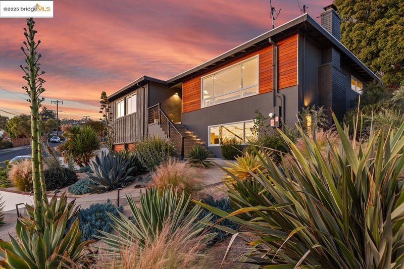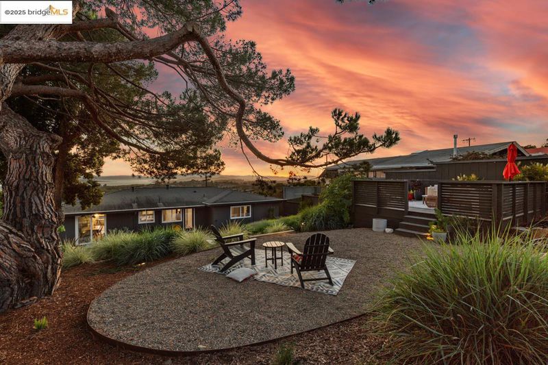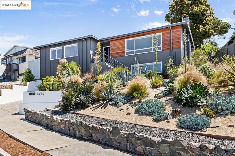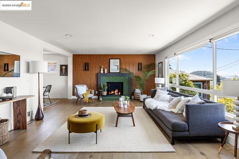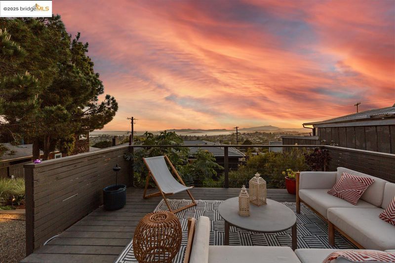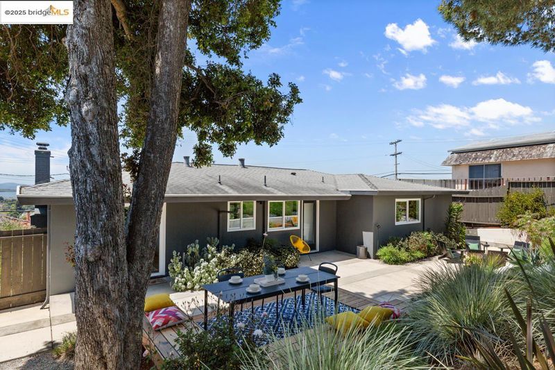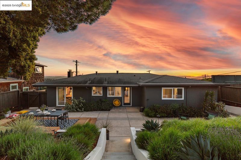 Set on an expansive lot, 7376 Stockton is a rare find. This mid century modern home offers sweeping Bay views, extensive updates, and a backyard that feels more like a private park than your typical yard. The main level features three spacious bedrooms and two full baths, all filled with natural light and clean, intentional design. Downstairs, a bonus space*—with its own entrance, bathroom and kitchenette—offers the kind of flexibility that makes life easier. The seller used it in the past for hosting visitors, working from home, and as extra living space. Throughout the home, you’ll find elevated design choices: custom Heath ceramic tile, sculptural light fixtures, and bold, well-placed color that adds personality. Step outside, and it only gets better—professionally landscaped grounds wrap around the house, layered with places to gather, garden, or just watch the sun slip behind the Golden Gate. With more than a dozen fruit trees, you might even snack along the way. Tucked into one of El Cerrito’s most beloved neighborhoods—minutes from Solano Avenue and zoned for Kensington Elementary*—this home is a rare blend of style, comfort, and setting. *Buyer to verify