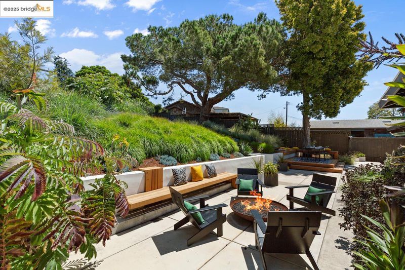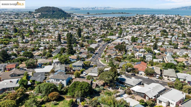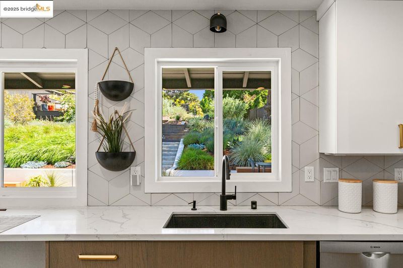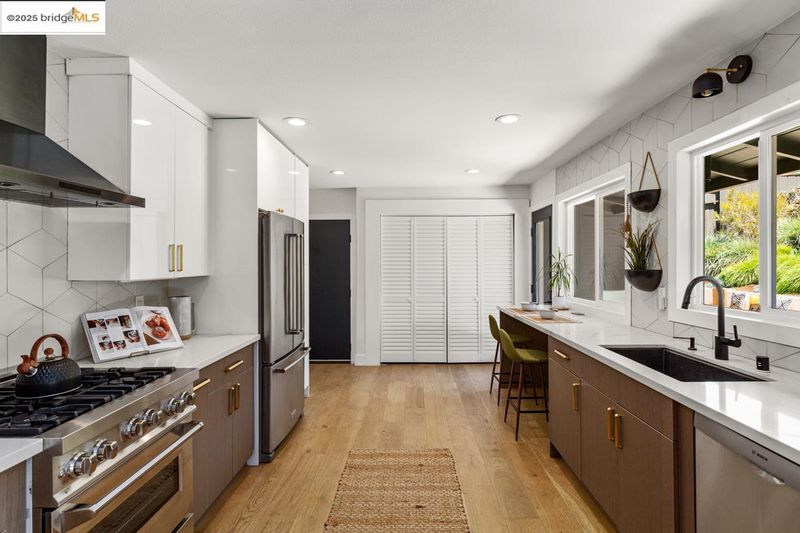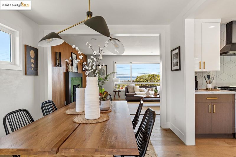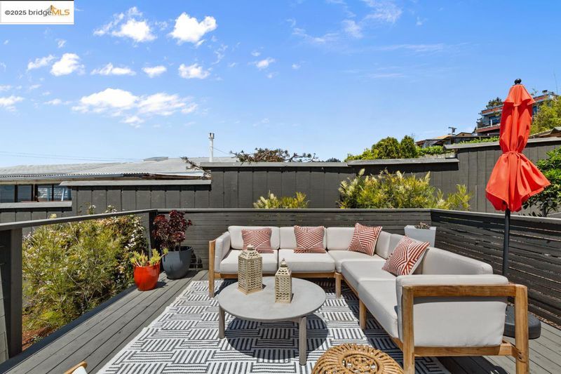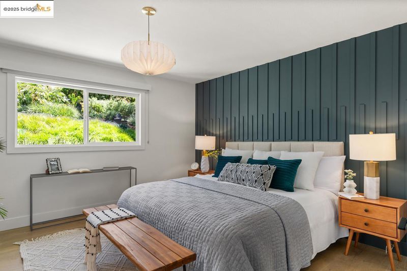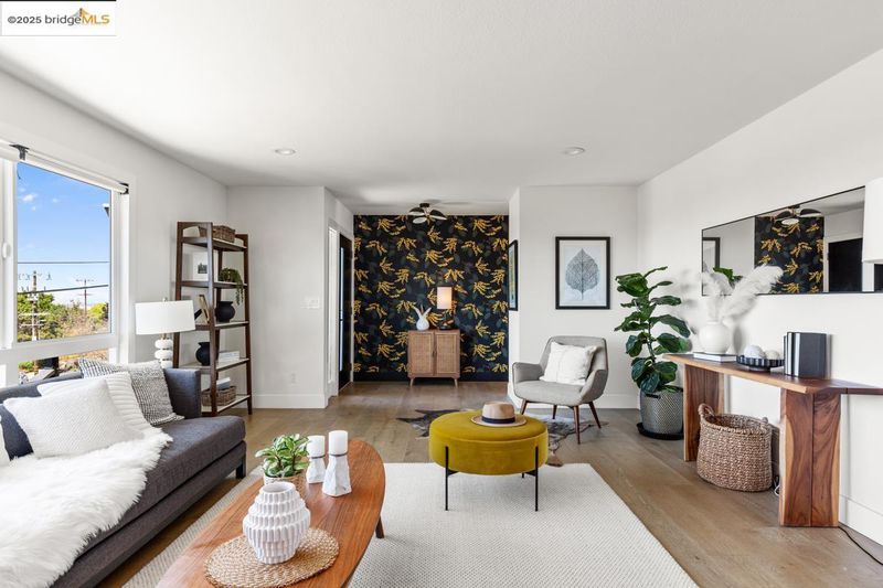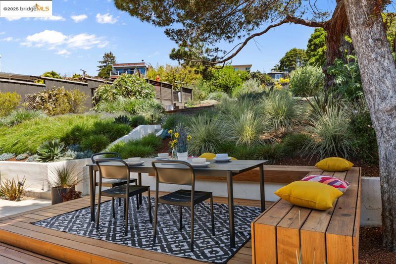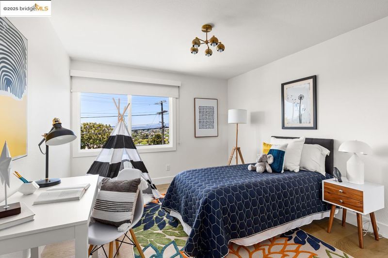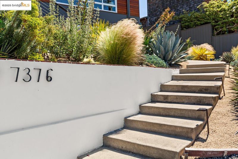 Set on an expansive lot, 7376 Stockton is a rare find. This mid century modern home offers sweeping Bay views, extensive updates, and a backyard that feels more like a private park than your typical yard. The main level features three spacious bedrooms and two full baths, all filled with natural light and clean, intentional design. Downstairs, a bonus space*—with its own entrance, bathroom and kitchenette—offers the kind of flexibility that makes life easier. The seller used it in the past for hosting visitors, working from home, and as extra living space. Throughout the home, you’ll find elevated design choices: custom Heath ceramic tile, sculptural light fixtures, and bold, well-placed color that adds personality. Step outside, and it only gets better—professionally landscaped grounds wrap around the house, layered with places to gather, garden, or just watch the sun slip behind the Golden Gate. With more than a dozen fruit trees, you might even snack along the way. Tucked into one of El Cerrito’s most beloved neighborhoods—minutes from Solano Avenue and zoned for Kensington Elementary*—this home is a rare blend of style, comfort, and setting. *Buyer to verify