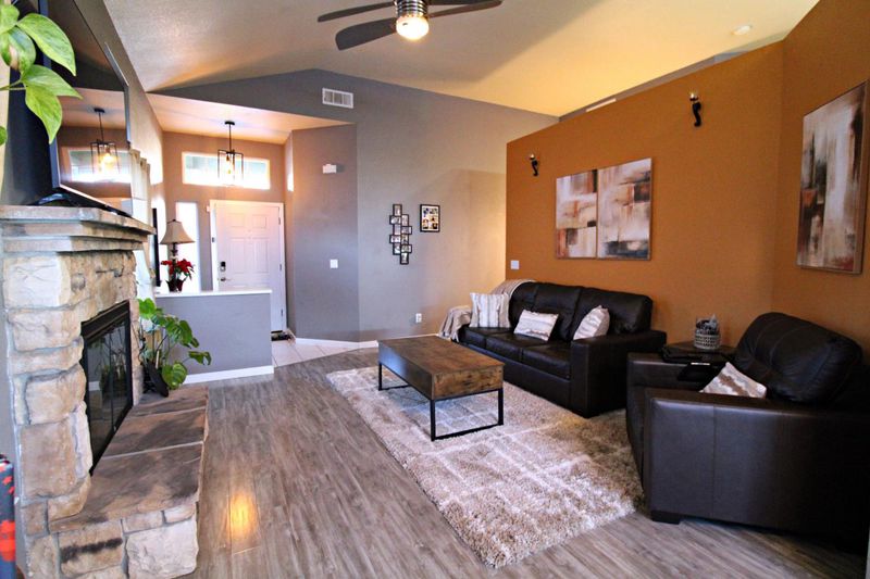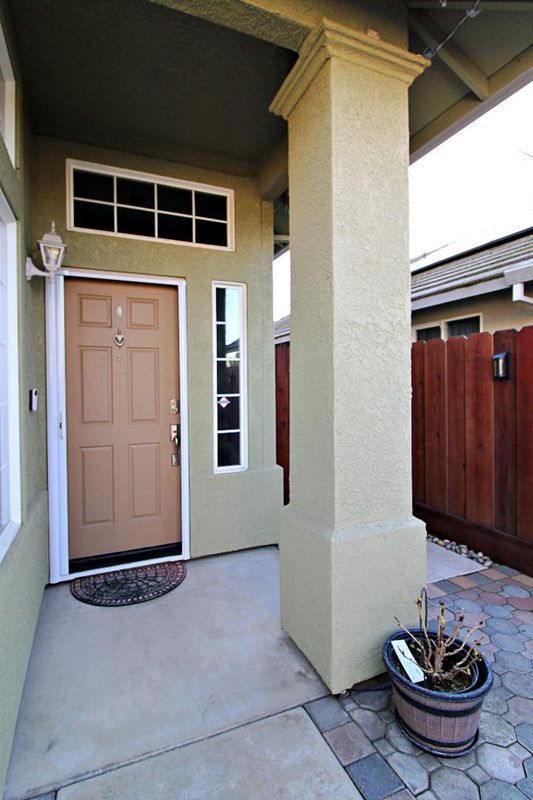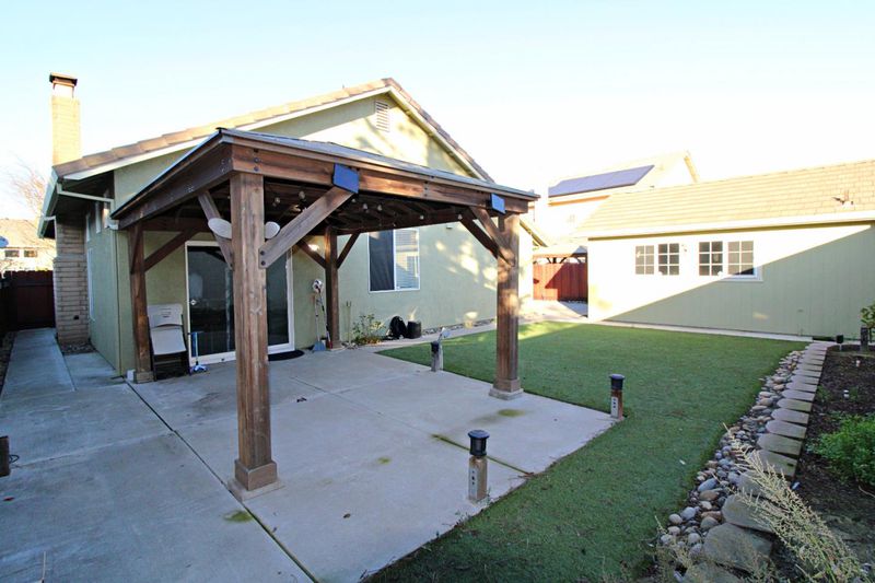 PRICE IMPROVEMENT!!!! Nice one story home with 3 bedrooms, 2 full bathrooms, and 3 car garage with owned solar system. Newer Heater and A/C with smart thermostat installed in 2025. The living room offers a cozy fireplace, and nice laminate flooring that extends to the dining area and kitchen. The kitchen includes modern appliances: refrigerator, stove, dishwasher and microwave. The Primary Suite offers private bathroom and walking closet. This house offers a nice enclosed patio in the front for privacy. The backyard has a large covered patio, with artificial turf which is perfect for family gatherings and entertainment. The detached garage/shop unit with half bathroom and A/C offers great potential for different uses. The property has large patio on the side of the house. Other upgrades include water purifier, water softener, and whole-house filter. Great location and easy access to shopping, dining, and highways 120, 205, and freeways I-5, and I-580.