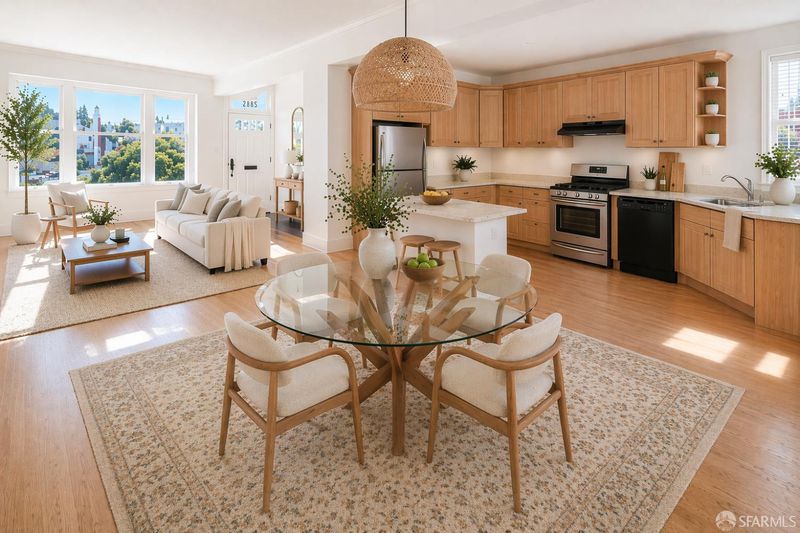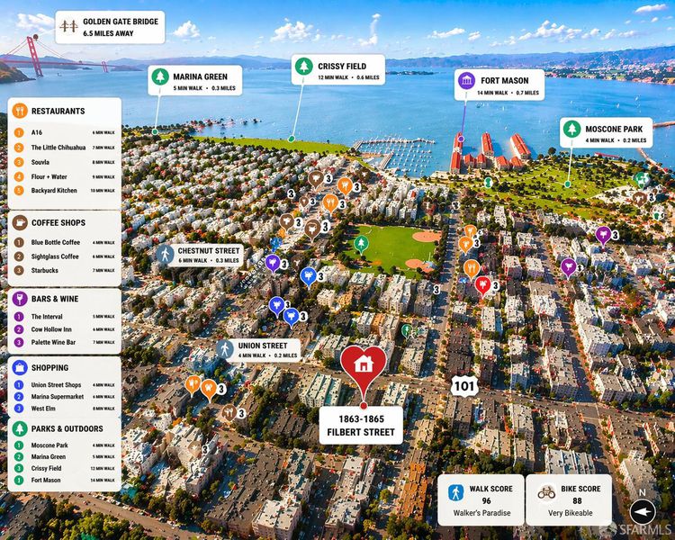 Perched in the heart of Cow Hollow, this rare two-residence property (2BD/1.5BA condo + 2BD/1.5BA single house) offers iconic San Francisco views spanning the Golden Gate Bridge and the bay, while delivering exceptional flexibility and strong income potential. Situated on a single lot, the property features two distinct, income-producing residences, a rare opportunity in this coveted neighborhood. With a possible near-term path to vacancy (buyer to verify/investigate), the property presents an ideal opportunity for owner-occupants, investors, 1031 exchangers, or those seeking a flexible hybrid living arrangement. 1865 Filbert is a spacious full-floor, 2-bedroom, 1.5-bath condominium within a classic two-unit Edwardian building (the lower flat), offering high ceilings and open floor-plan. Privately positioned at the rear, the standalone 1863 Filbert is a tastefully updated two-story single house featuring 2 bedrooms and 1.5 baths, rich in charm and character. A serene turf yard creates a natural separation between the two homes, while a shared roof deck showcases breathtaking panoramic views of the bay, the full span of the Golden Gate Bridge, and the city skyline. An extraordinary setting for entertaining or everyday living. The condo generates stable income at $6,750/month ($81,000 annually).The single house is currently leased month-to-month at $6,375/month ($76,500 annually). Current gross income is $157,500. A truly special offering in one of San Francisco's most desirable neighborhoods, combining privacy and unparalleled lifestyle with effortless walkability. Just moments from the vibrant shops, dining, cafes of Union/Chestnut, the Presidio, Crissy Field, and Fort Mason. With an exceptional 98 walk score and easy access to Hwy 101, this location offers the best of city living imaginable. *Images are virtually staged/enhanced to illustrate potential.