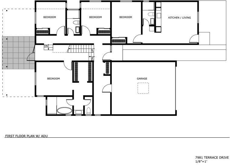 Set back from the street on a sun-drenched 10,000+ sq ft lot (per public record) & nestled among redwood trees, 7981 Terrace is truly an exceptional property. Architect-designed & built in 2017, this mid-century modern influenced home offers 4 beds, 3.5 baths, and attached 1-bed/1-bath ADU. Step inside & your eyes are drawn straight through glass double doors to the breathtaking backyard & the elegant stairway to the second level. The main floor features a luxurious primary bedroom w/en-suite bath, 2 additional beds & full bath and polished concrete floors. Ascend the stairway & be delighted by the open floor plan & many windows. The gourmet kitchen boasts beautiful quartzite counters & abundant space for any chef. The living room centers around a Rais wood-burning fireplace, while a covered deck w/built-in gas BBQ beckons for indoor-outdoor entertaining. An additional flexible room serves perfectly as a bedroom or office, plus a convenient half bath. The level, park-like backyard must be seen to be believed—offering endless possibilities for hide & seek, gardening, & relaxation. 2 outbuildings, one w/a full bath, provide versatile bonus space. The 1-bed/1-bath ADU mirrors the sophistication of the main house & can be rented for income or connected to the main house. A must see!